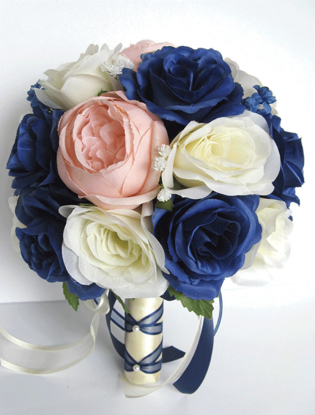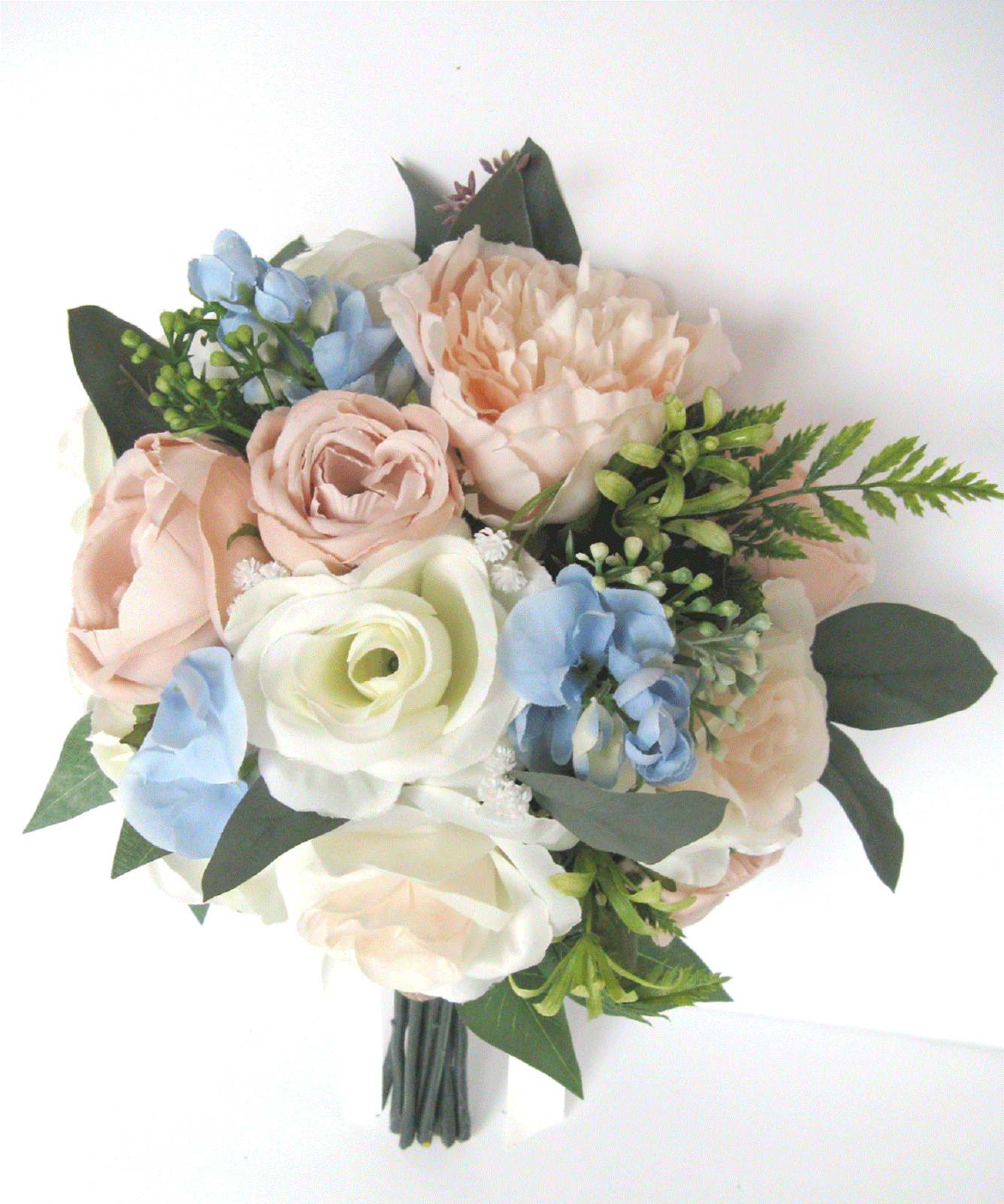 Wedding Bouquets 17 Piece Package Bridal Bouquet Flowers Peach Blush Dusty Blue Ebay